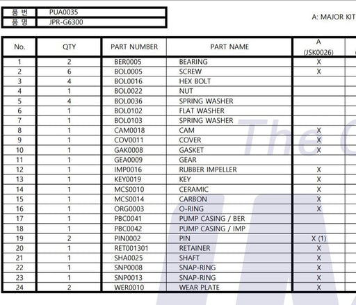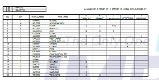Marine EnergyService Kit (Major) Seawater Pump JMP JPR-G6300, JPR-CT353This is a non-OEM, aftermarket part JMP JSK 0026 - Major Service Kit.
