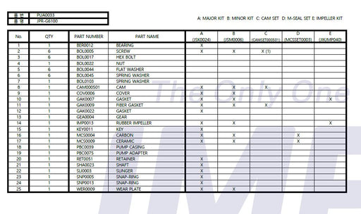 Marine EnergyService Kit (Major) Seawater Pump JMP JPR-G6100This is a non-OEM, aftermarket part JMP JSK 0024 - Major Service Kit. Minor Repair Kit Also Availabl...